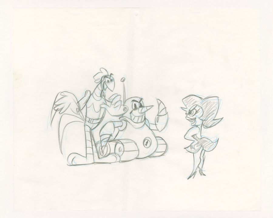 A production drawing from the DiC Studios animated series "The Adventures of Sonic the Hedgehog" (1993-1999). Featuring a great illustration of Breezy, Grounder, and Scratch, the graphite drawing was created at the studio and used during the animation process. Measuring 13.5"x16.5" overall, with the character image measuring 7"x11.5", the drawing is in very good condition with wear from age and handling including edge wear, discoloration, and smudging.