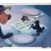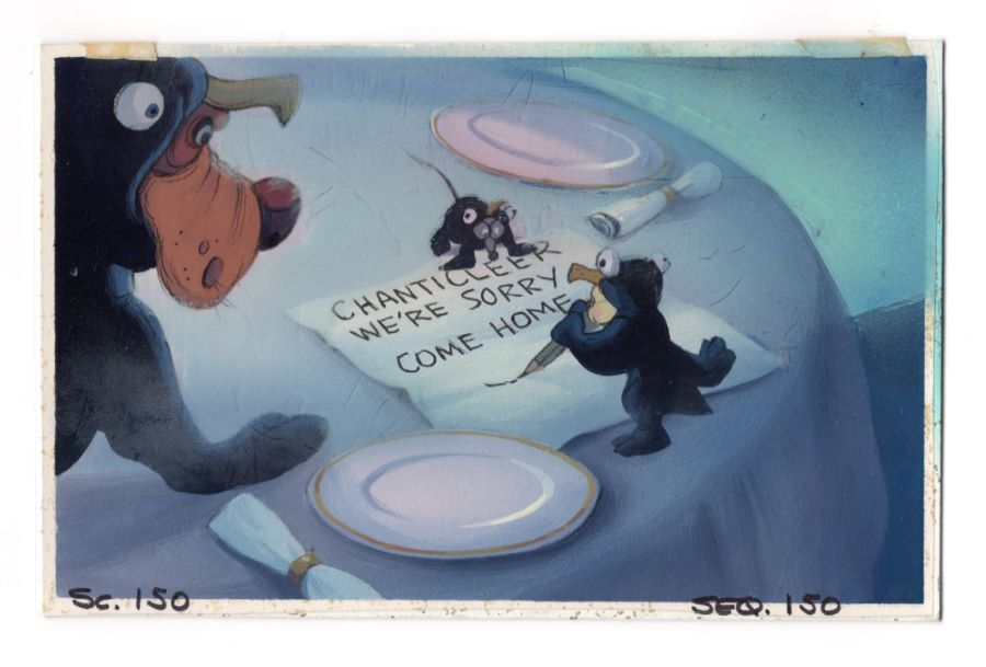 A background color concept that was used during the development of the Don Bluth Productions film Rock-A-Doodle (1992). Featuring Edmond, Patou, and Peepers dressed as Penguins and writing a letter to get Chanticleer to come home, the painted concept was created at the studio and used during the early development of the film. Don Bluth Productions uniquely used these concepts not only to develop the scene's color palette, style, and emotion, but also as storyboards to visualize the full story development. Measuring 5"x8" overall and with the image area measuring 4.75"x7.75", the background color key concept is in fine condition.